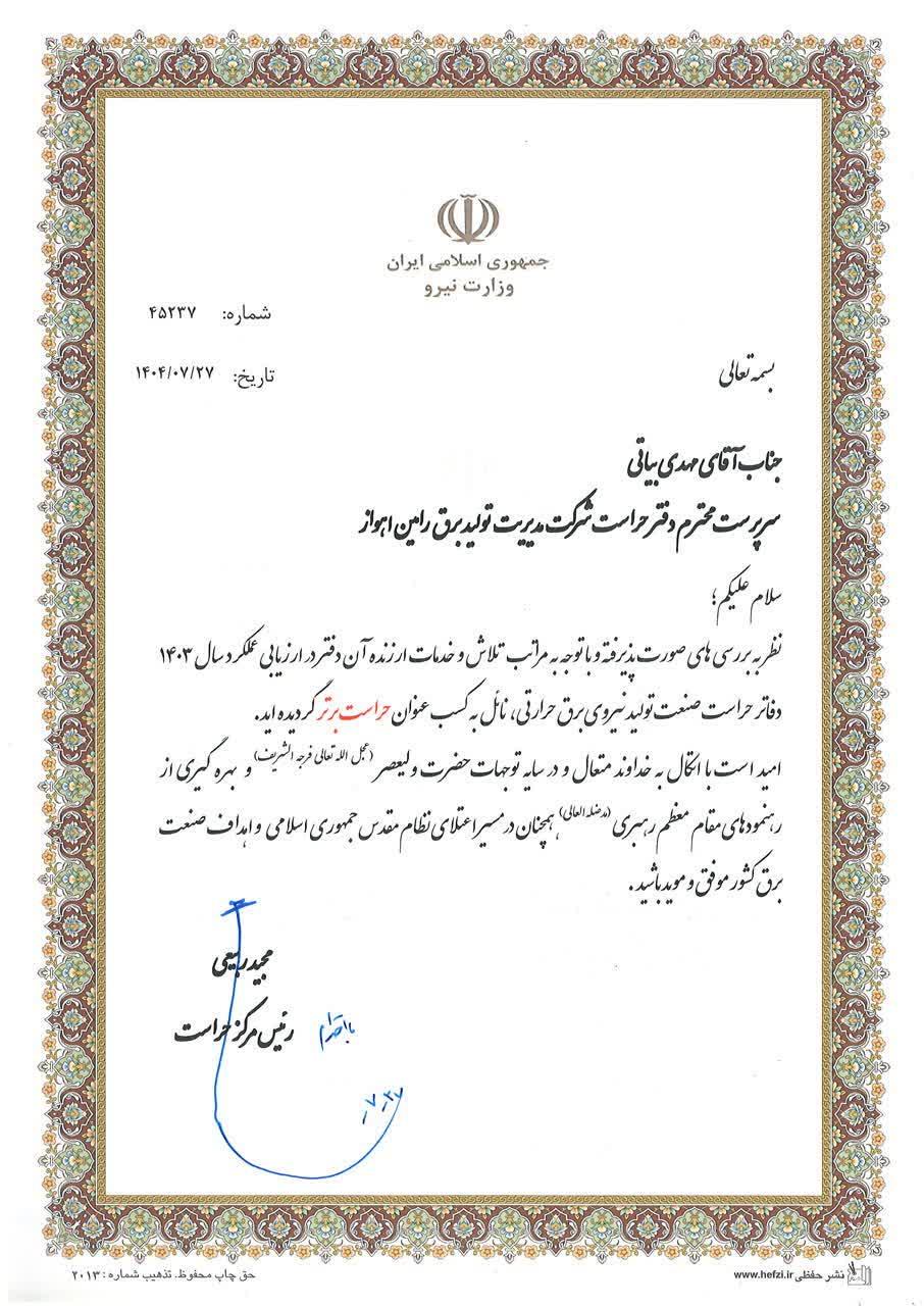 به گزارش روابط عمومی نیروگاه رامین اهواز: در ارزیابی عملکرد سال ۱۴۰۳حراست های صنعت برق حرارتی کشور ، دفتر حراست و امور محرمانه نیروگاه رامین اهواز موفق به کسب رتبه برتر شد.