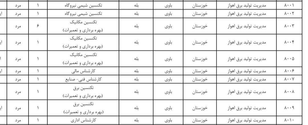 شرکت مادر تخصصی تولید نیروی برق حرارتی در نظر دارد نیازهای نیروی انسانی خود در شرکتهای مدیریت تولید برق (نیروگاهها) را به استناد مجوز صادره توسط وزارت نیرو و بر اساس موافقت مجمع عمومی شرکتهای مذکور، به تعداد 200 نفر برای اشتغال در مشاغل تکنسینی/کمک کارشناسی و کارشناسی از میان فارغالتحصیلان دانشگاهها و موسسات آموزش عالی مورد تایید وزارت علوم، تحقیقات و فناوری، تامین کند.